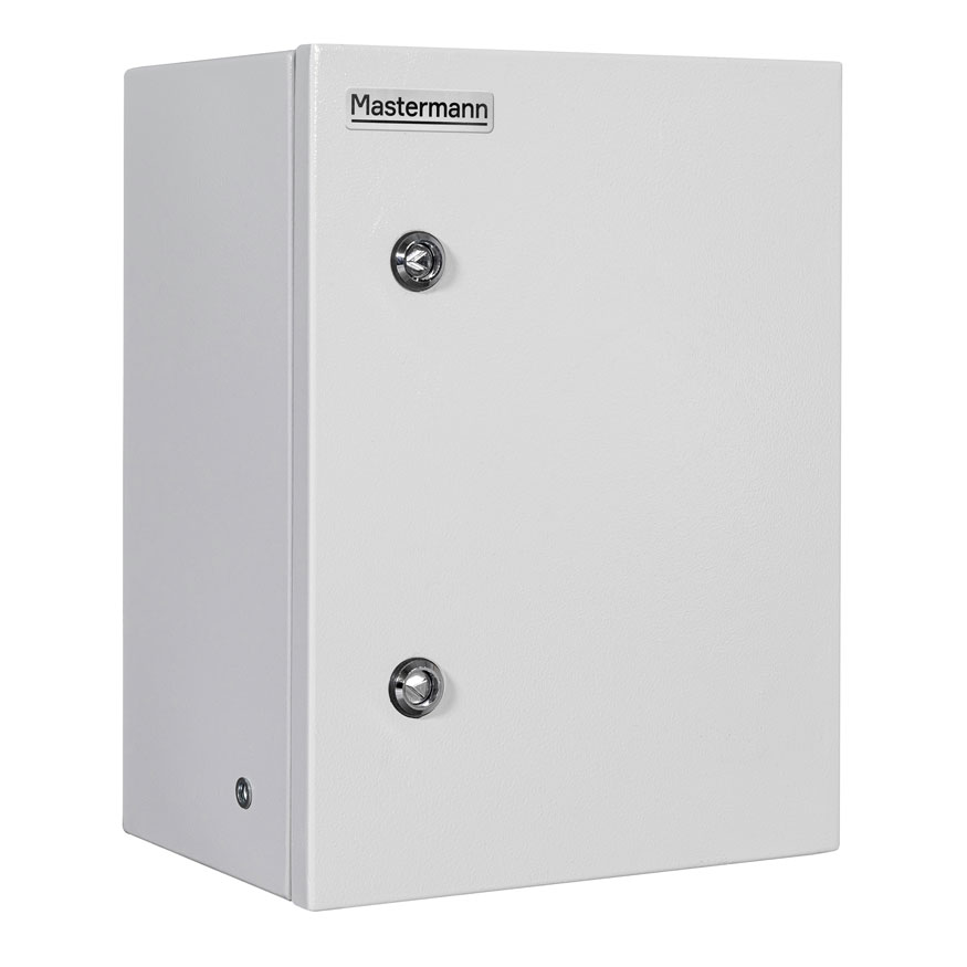 Шкаф монтажный универсальный с монтажной платой и двумя замками; два гермоввода (MG-25); IP66, 300×400×150 мм (Ш×В×Г), полезная глубина 95 мм, 5.5 кг. Цвет серый.