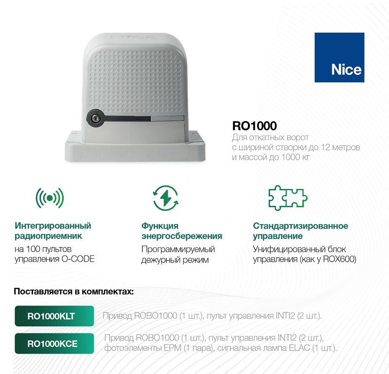Новинка - привод Nice Robo 1000 для откатных ворот (с шириной створки до 12 метров и массой до 1000 кг) нового поколения, разработанный для замены популярной серии ROX1000.